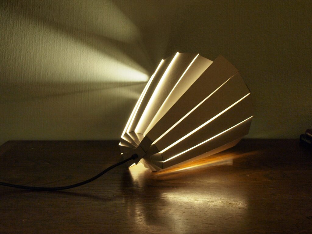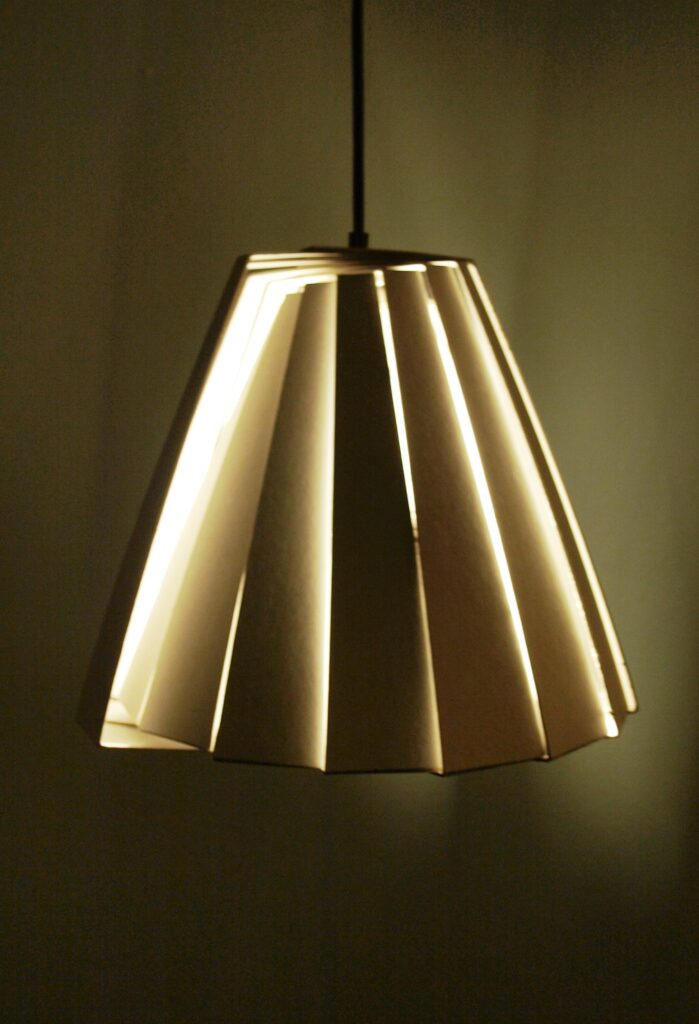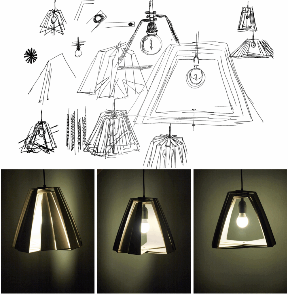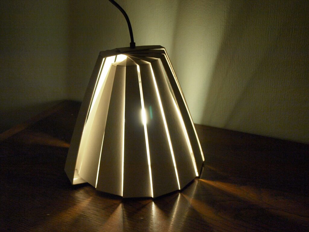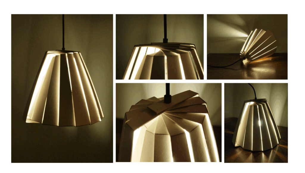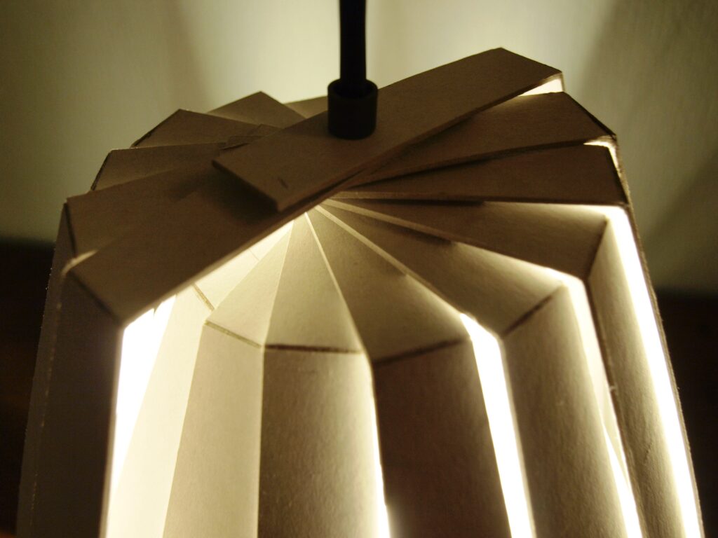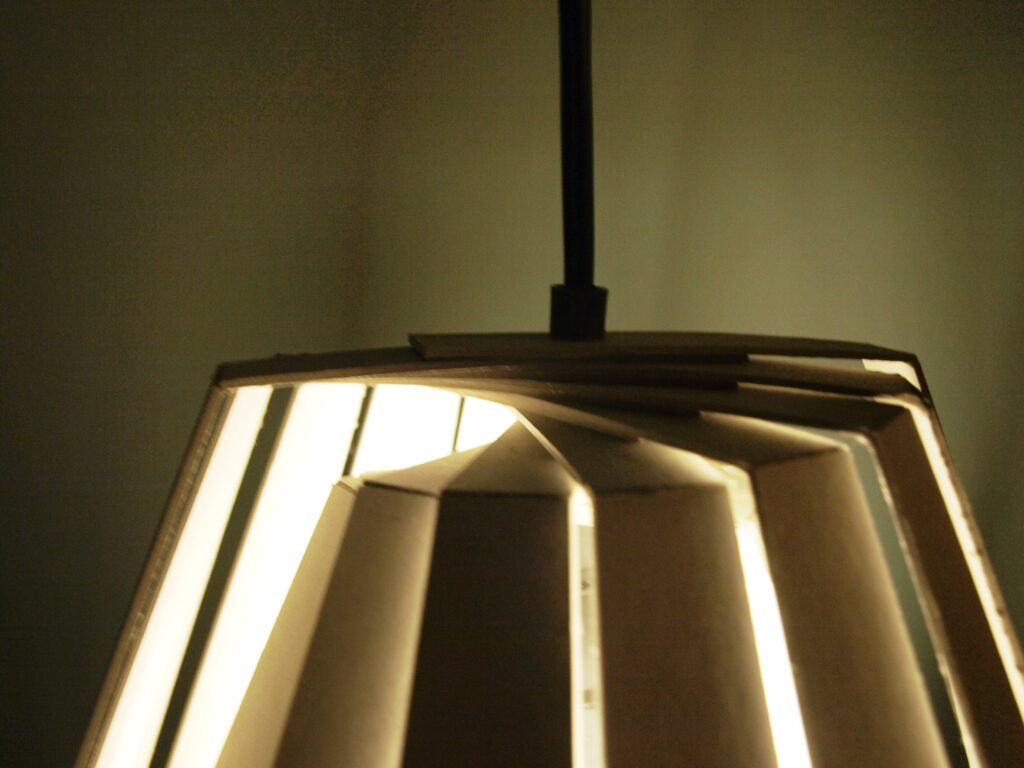 Ideen er at alle lamellerne skal kunne udstanses i et stykke pap, ved denne lampestørrelse måler pappet 70×100. Ved at lade lamellerne forblive i arket, for først at blive trykket ud og monteret på ledning ved køb, bliver det nemt, samt energibesparende, at distribuerer denne type rundt i verden. Samtidig vil den ikke optage dyrebar opbevaringsplads.